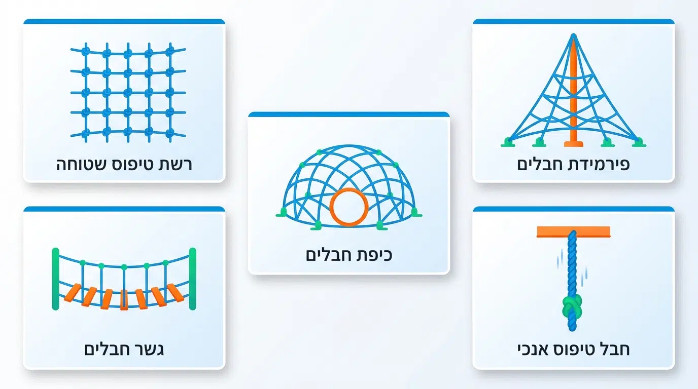 | כיפת חבלים | מבנה כיפתי עם רשת חבלים | 4 ומעלה | מאפשר טיפוס וישיבה בפנים |