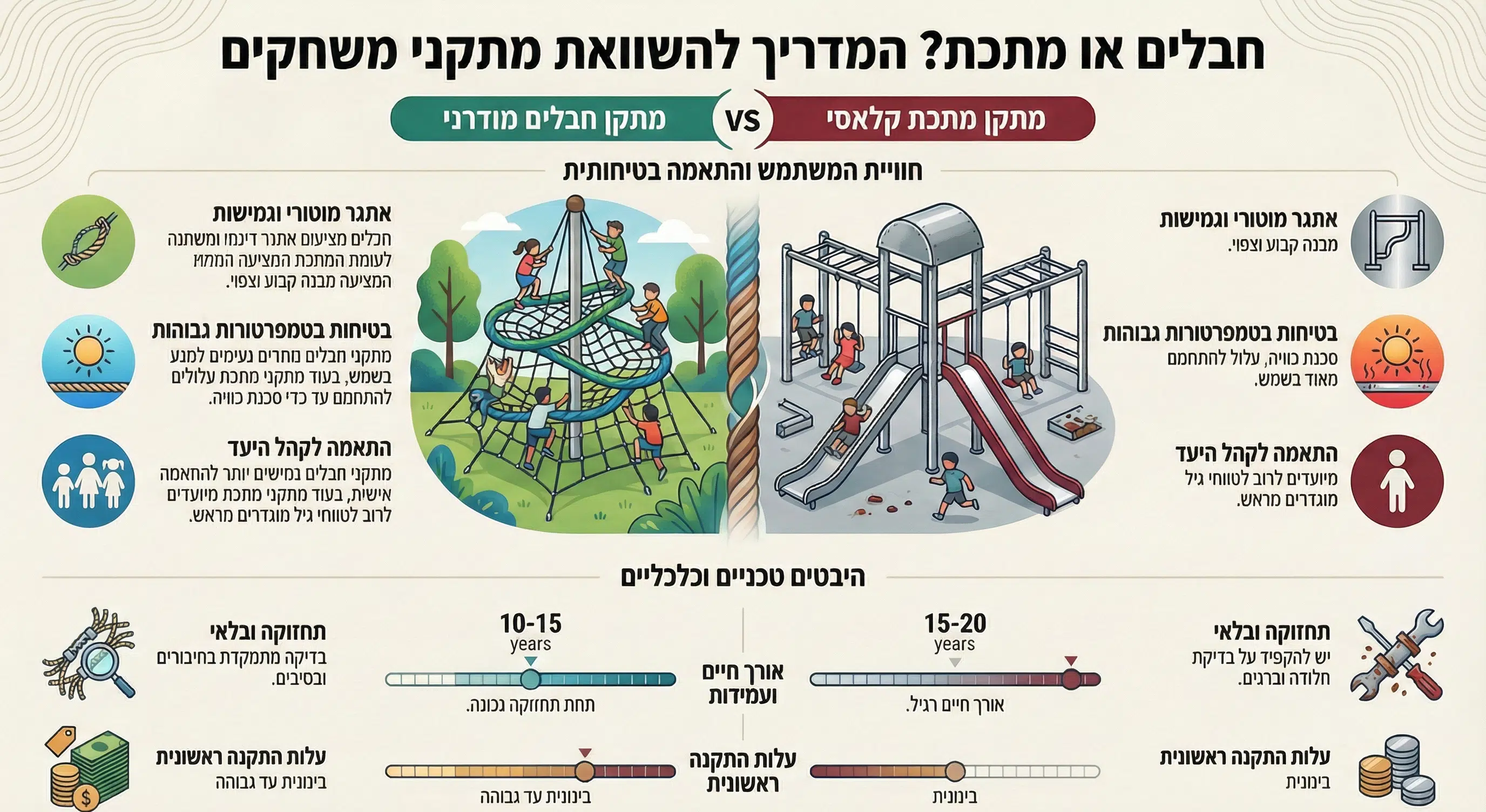 מתקני חבלים לגני שעשועים הפכו בשנים האחרונות לאחד הפתרונות המבוקשים ביותר בתכנון מרחבי משחק לילדים. מחקרים מראים כי ילדים המשתמשים במתקני טיפוס חבלים מפתחים יכולות מוטוריות מתקדמות יותר ב-40% לעומת מתקנים קונבנציונליים.